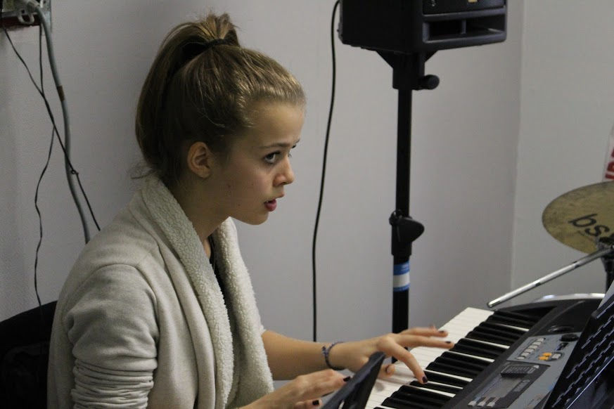 Les élèves du groupe musique actuelle travaillent sur une des trois parties que nous devons réaliser. Il se compose d'un guitariste, une bassiste, une pianiste, un batteur, une chanteuse ainsi qu'un deuxième pianiste qui joue le rythme des percussions. Nous écoutons les consignes d'Antoine qui nous dirige. Nous faisons de notre mieux pour faire du bon travail.Nous sommes fiers de ce que nous faisons.